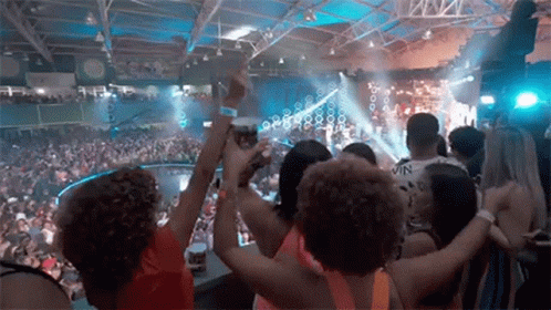 Fans cheer and raise their hands at a lively Vou Pro Sereno concert, enjoying the show.