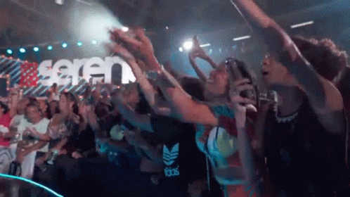 Energetic crowd at a 'Vou Pro Sereno' concert, with fans cheering and hands in the air.