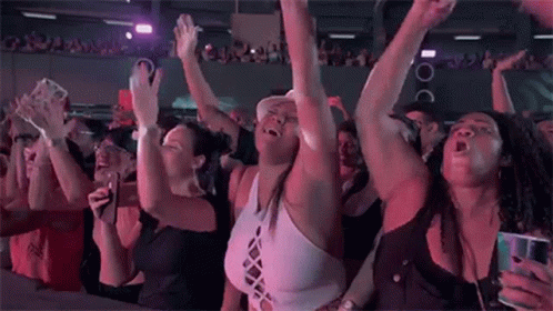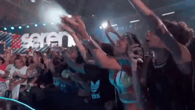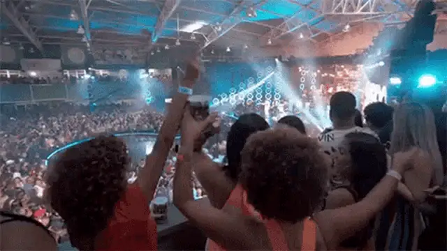 Enthusiastic fans cheer and sing along at a lively concert for the band Vou Pro Sereno.