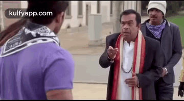 Brahmanandam animatedly talks and gestures to another man in a lively scene, featuring his iconic 'Fasak' expression.