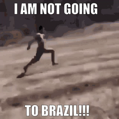 A cartoon figure runs frantically across a sandy landscape, declaring 'I AM NOT GOING TO BRAZIL!!!'