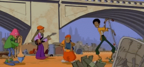 Fat Albert and the Cosby Kids play instruments in a lively junkyard band performance.