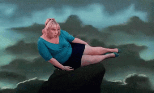 Fat Amy strikes a pose on a rock with a dramatic water splash, parodying The Little Mermaid.