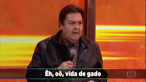 Faustão, the Brazilian TV presenter, holds a microphone and exclaims 'Eh, oô, vida de gado'.