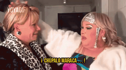 Fausto, possibly with Janin or Katiuska, dramatically yells '¡Chúpalo Maraca!' in a heated moment, wearing a glamorous drag outfit.