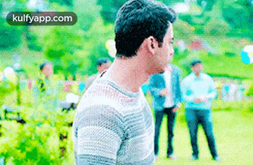 Fawad Khan, wearing a striped sweater, covers his face with his hands in an emotional reaction in a park setting.