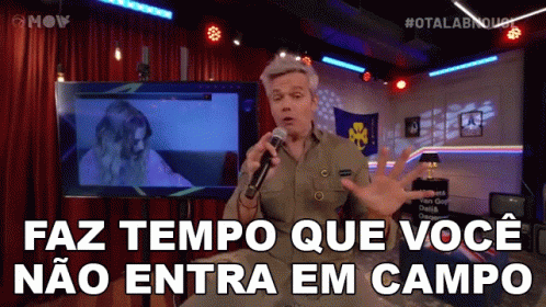 Otaviano Costa speaks into a microphone, delivering the phrase 'Faz Tempo Que Você Não Entra Em Campo'.