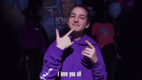 Fazeewok in a purple hoodie uses sign language to express 'I love you all' and 'Thank you for your support'.