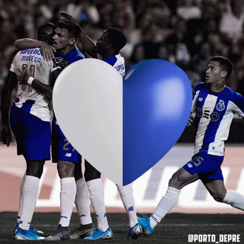 FC Porto soccer players celebrate on the field, with a large blue and white heart graphic symbolizing the team's colors.