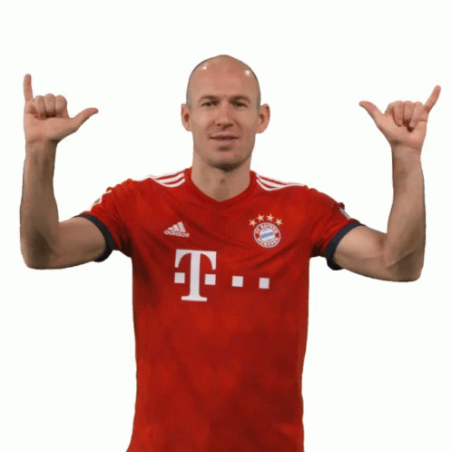 Arjen Robben, wearing an FC Bayern Munich jersey, smiles and makes a hang loose gesture with both hands.