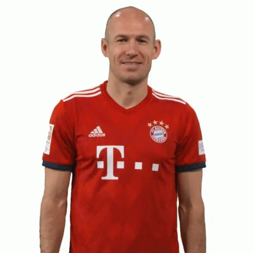 Arjen Robben, wearing his FC Bayern Munich jersey, smiles and kisses the club badge, showing his affection for the team.