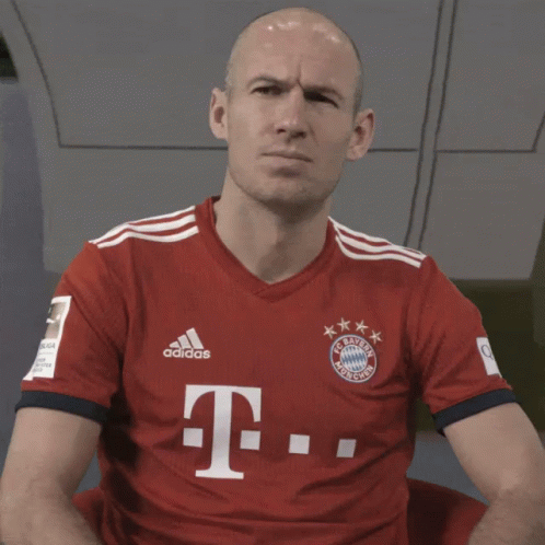 Arjen Robben, wearing an FC Bayern jersey, reacts with a classic facepalm gesture.