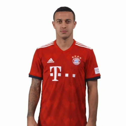 Thiago Alcântara of FC Bayern Munich performs a respectful gesture in his red Adidas jersey.