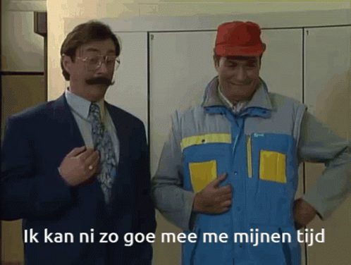Two men humorously express difficulty keeping up with modern times, pointing to themselves.