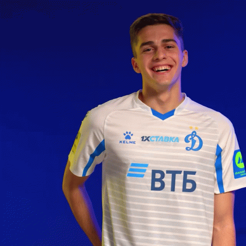 A young Fc Dynamo Moscow player is seen laughing and smiling, wearing his team jersey.