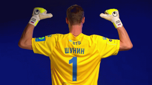 Anton Shunin, goalkeeper for FC Dynamo Moscow, wearing his number 1 jersey and gloves with his name.