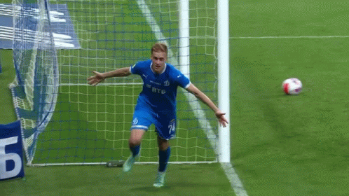 Konstantin Fomin of Dynamo Moscow celebrates scoring a goal, running with arms outstretched in joy.