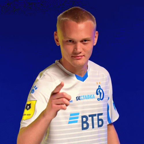 FC Dynamo Moscow player Konstantin Tyukavin winks and points, wearing his team's white and blue striped jersey.