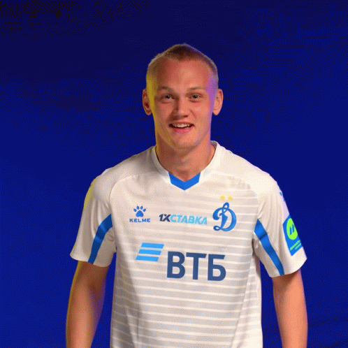 Fc Dynamo Moscow player Tyukavin celebrates a victory with excitement, wearing his team's white jersey.