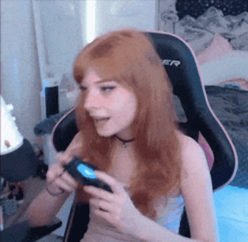 Feebux Feebuns playfully bites her gaming controller while sitting in a chair.