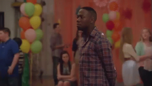Winston from New Girl is seen at a party, looking around with a thoughtful expression, feeling the beat.
