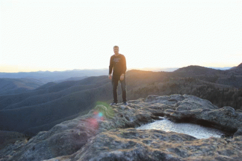A man joyfully dancing on a mountain peak at sunset, celebrating the scenic views and feeling good.