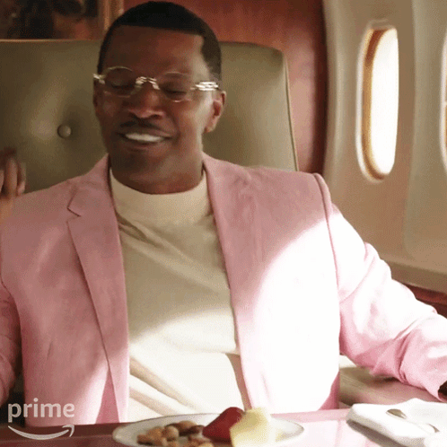 Jamie Foxx as Willie Gary, dressed in a pink jacket, enjoys a meal and vibes to music on a private jet.