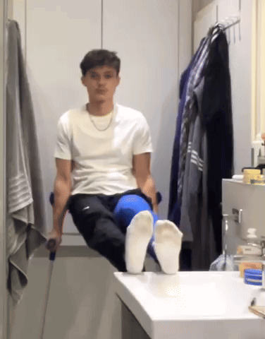 A young man with a knee brace balances on crutches with his feet on a bathroom sink, showcasing his unique skill.
