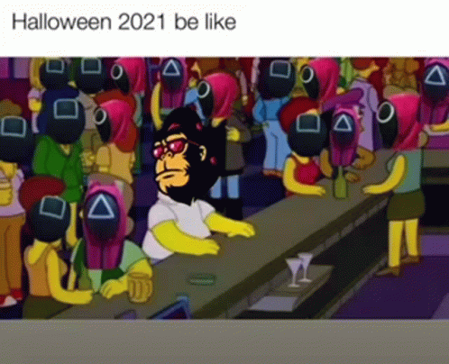 A meme depicting Halloween 2021 with a Bored Ape character in a Simpsons bar surrounded by people in Squid Game masks.