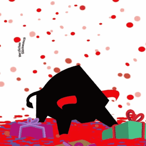 Animated bull celebrates with falling confetti and gifts, displaying 'Herzlichen Glückwunsch'.