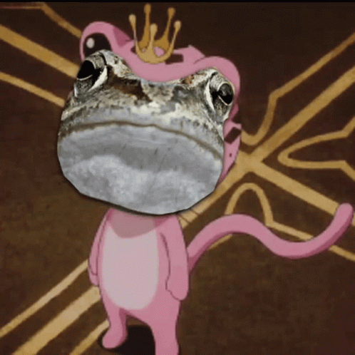 Pink Fairy Tail character with a frog head and crown looks at the camera.