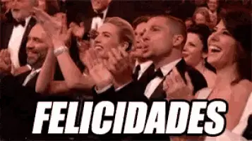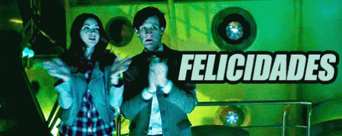 A man and a woman clap enthusiastically in a green-lit setting, with 'Felicidades' (Congratulations) displayed.