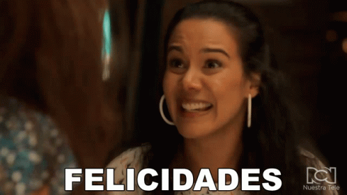 A woman from Cafe Con Aroma De Mujer joyfully exclaims "Felicidades" (Congratulations) with a big smile.