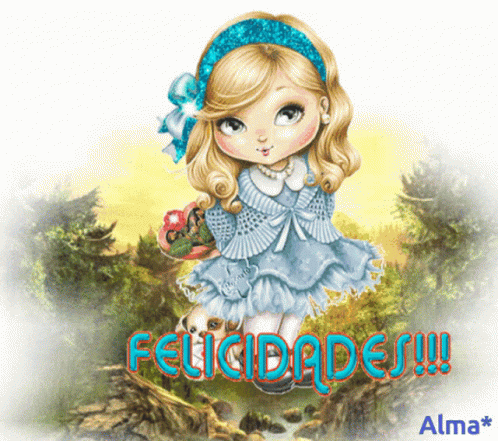 A sweet cartoon girl in a blue dress with blonde hair, holding flowers, wishing 'Congratulations!!!'