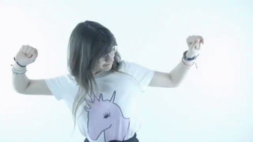 Girl in unicorn shirt and glasses smiling and dancing, performing a twerk.
