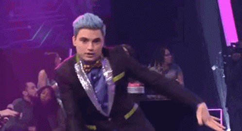 Felipe Neto, the vlogger and Youtuber, performs a lively dance on stage in a suit and bow tie.