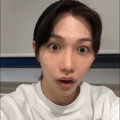 Felix from Stray Kids reacts with wide-eyed surprise, then covers his mouth in a laugh.