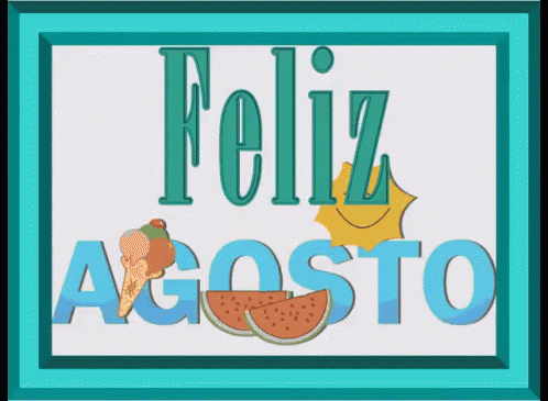 A vibrant graphic wishing 'Happy August' featuring an ice cream cone and refreshing watermelon slices.