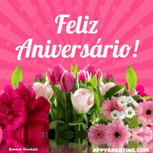 A vibrant birthday greeting featuring a pink background adorned with flowers and the Portuguese phrase "Feliz Aniversário Parabéns."