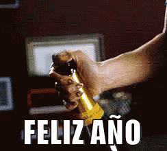 A hand pops open a bottle of champagne, celebrating the New Year with 'Feliz Año' on screen.