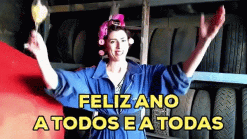 Woman in hair rollers and jumpsuit wishes everyone a Happy New Year, holding a glass of champagne.