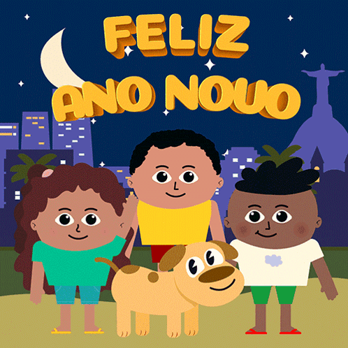 Animated children and a dog celebrate New Year's Eve in Rio de Janeiro, wishing a Happy New Year 2024.