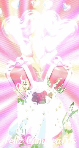 A vibrant animated birthday greeting featuring a cake, gifts, heart balloons, and flowers with sparkling effects.