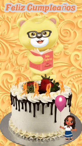 Animated birthday greeting for Zaidy with a cake, teddy bear, and girl holding a balloon.