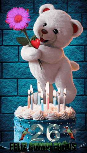 Cute teddy bear holding a flower and a heart, standing on a vibrant blue birthday cake with lit candles and the number 26.