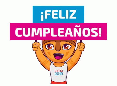 Animated Lima 2019 mascot celebrates with a 'Happy Birthday!' sign, spreading cheer.