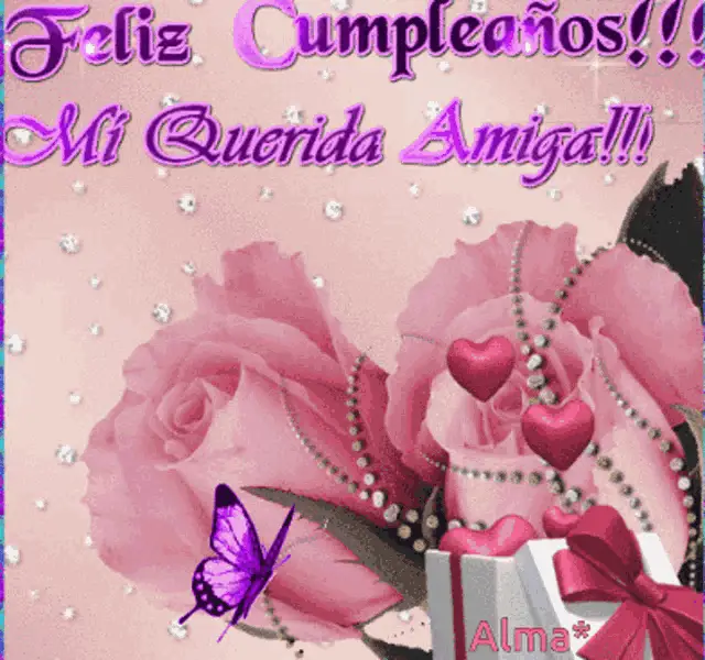 Animated birthday card with 'Feliz Cumpleaños' and 'Dios Te Bendiga, Amiga' messages, featuring colorful balloons.
