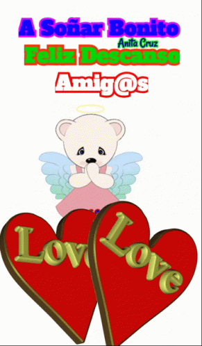 A sweet teddy bear angel with hearts saying 'Love' and a Spanish message 'Feliz Descanso Amig@s' (Happy Rest, Friends).