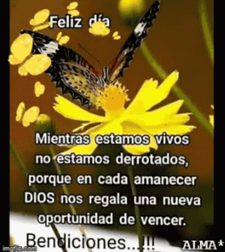A beautiful butterfly rests on a yellow flower with an inspiring Spanish message about hope and new opportunities each day.