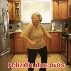 An older woman joyfully dancing in a kitchen, celebrating Grandmothers' Day with an on-screen message.